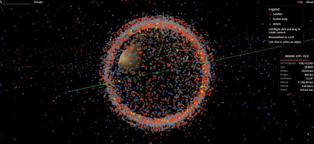 Cada uno de los nombres que pueden ver en la imagen corresponde a un objeto que gravita alrededor del planeta. Algunos de ellos son satélites activos, otros en cambio ya están inactivos aunque continúan orbitando, y también figuran los fragmentos de cohete y otra basura espacial producida por el hombre… por el momento nadie se ocupa de hacer limpieza.
