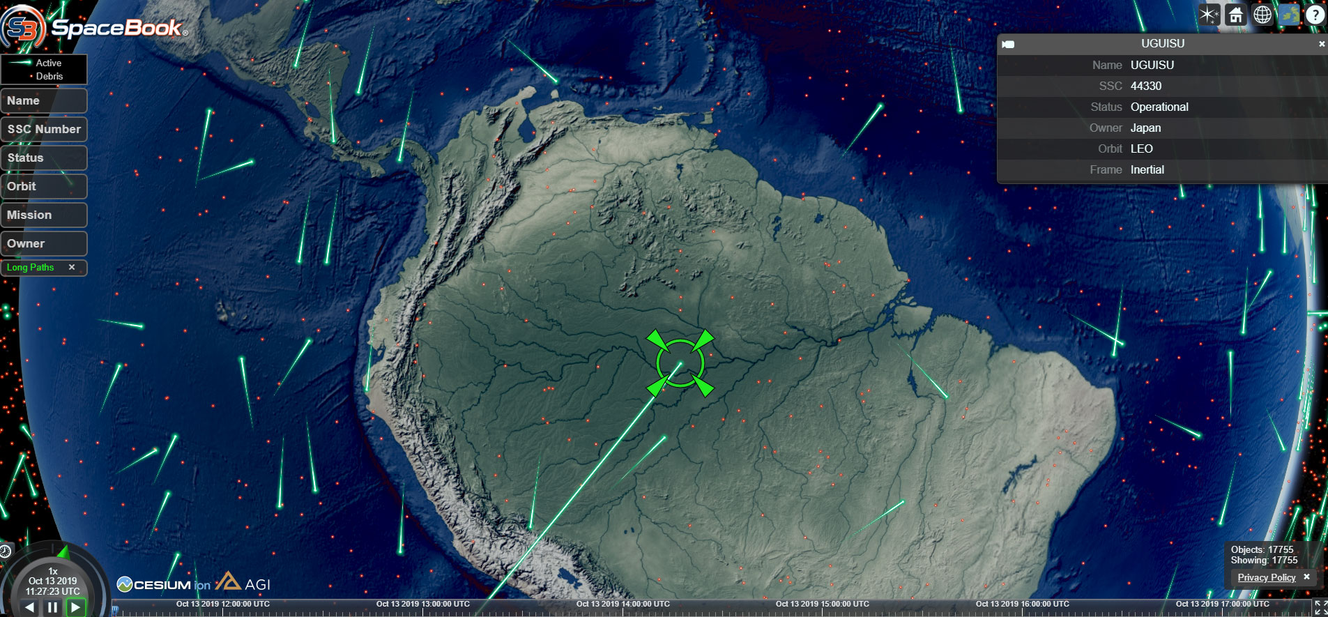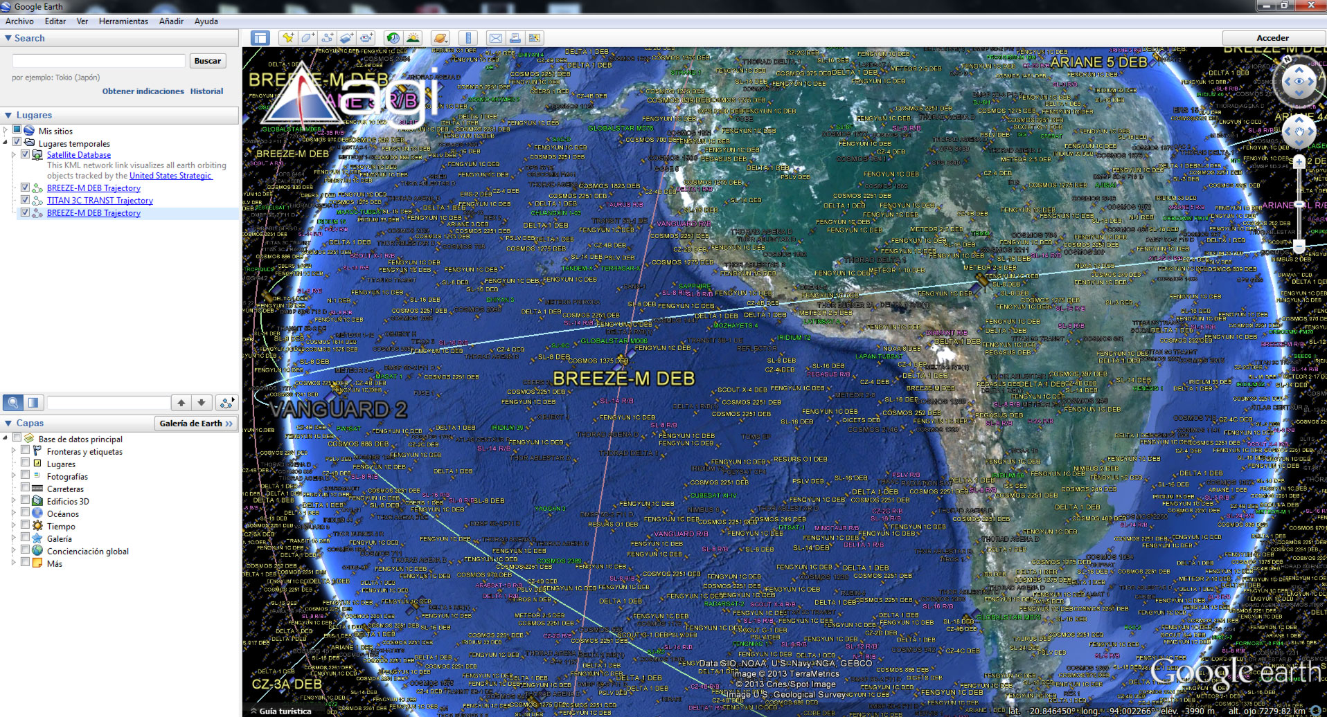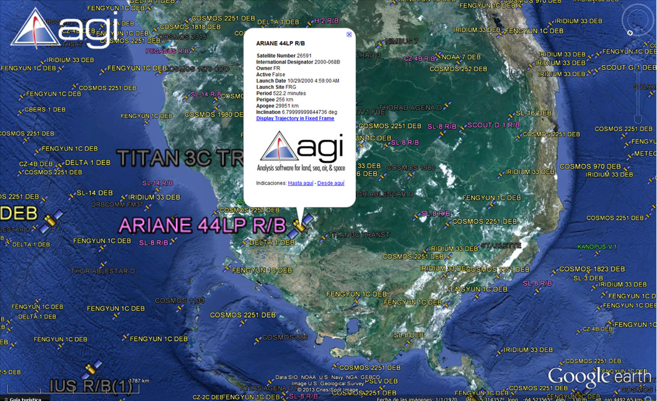 Pueden descargarse la base de datos de los satélites en forma de archivo KMZ. Una vez bajada al computador la pueden abrir con Google Earth, desde dónde se actualiza cada 30 segundos. Podrán dibujar cada órbita individual y obtener información de cada satélite. Es de libre acceso y monitorea los más de 12.000 objetos que el humano tiene actualmente en orbita. De ellos, unos 3.000 son satélites operativos, según nos informa la AGI, que procesa la base de datos para el United States Strategic Command, que monitorea y ha registrado los más de 26.000 objetos espaciales lanzados desde que en 1.957 el Sputnik 1 estrenó la era satelital. Como desde principios de 2015 ya no es posible ni visualizar ni descargar la base de datos para Google Earth te proponemos que te asomes a la espectacular aplicación de AGI para Cesium que se ve así: